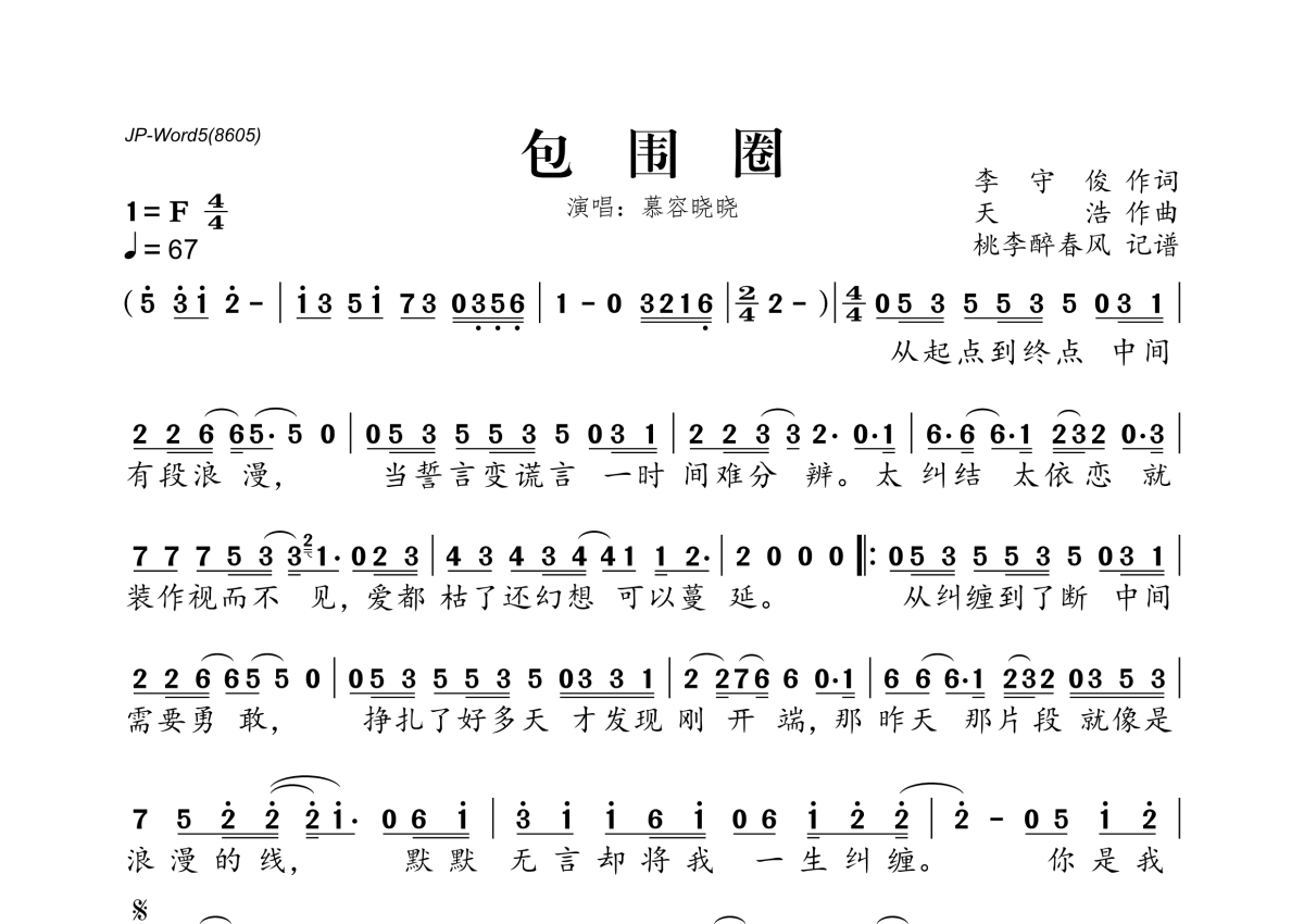 《包围圈》是慕容晓晓演唱的一首歌曲,拍号为4/4拍,歌曲速度为每分钟67拍,这份简谱共有一张高清图谱,图谱由 @桃李醉春风 编配上传。