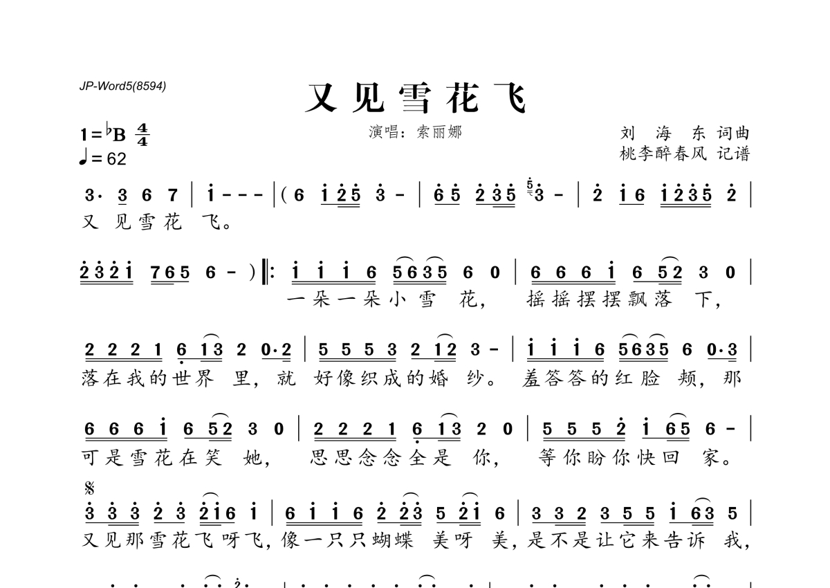 《又见雪花飞》是索丽娜演唱的一首歌曲,拍号为4/4拍,歌曲速度为每分钟62拍,这份简谱共有一张高清图谱,图谱由 @桃李醉春风 编配上传。