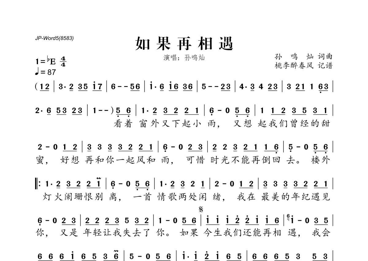 《如果再相遇》是孙鸣灿演唱的一首歌曲,拍号为4/4拍,歌曲速度为每分钟87拍,这份简谱共有一张高清图谱,图谱由 @桃李醉春风 编配上传。