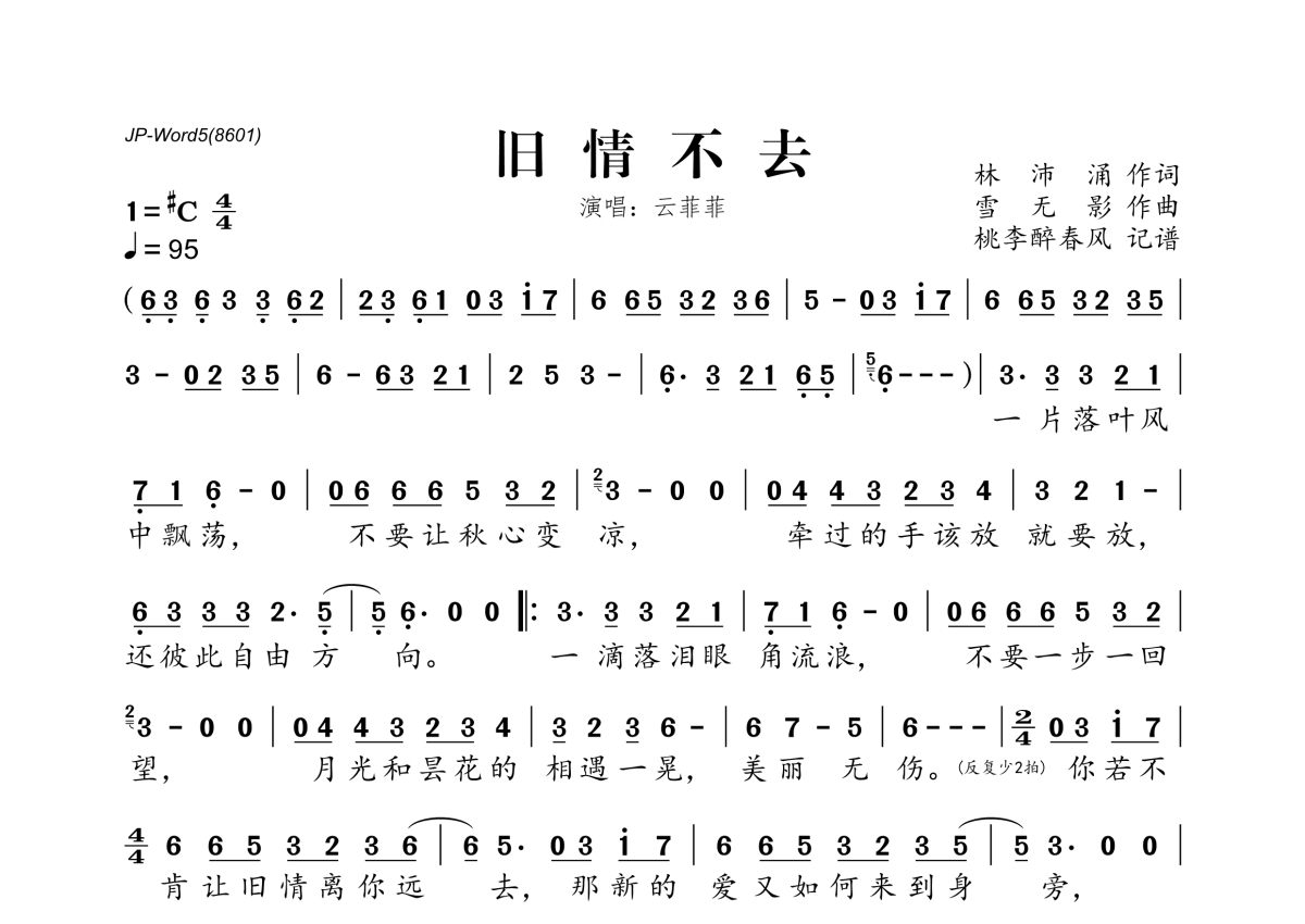 《旧情不去》是云菲菲演唱的一首歌曲,拍号为4/4拍,歌曲速度为每分钟95拍,这份简谱共有一张高清图谱,图谱由 @桃李醉春风 编配上传。