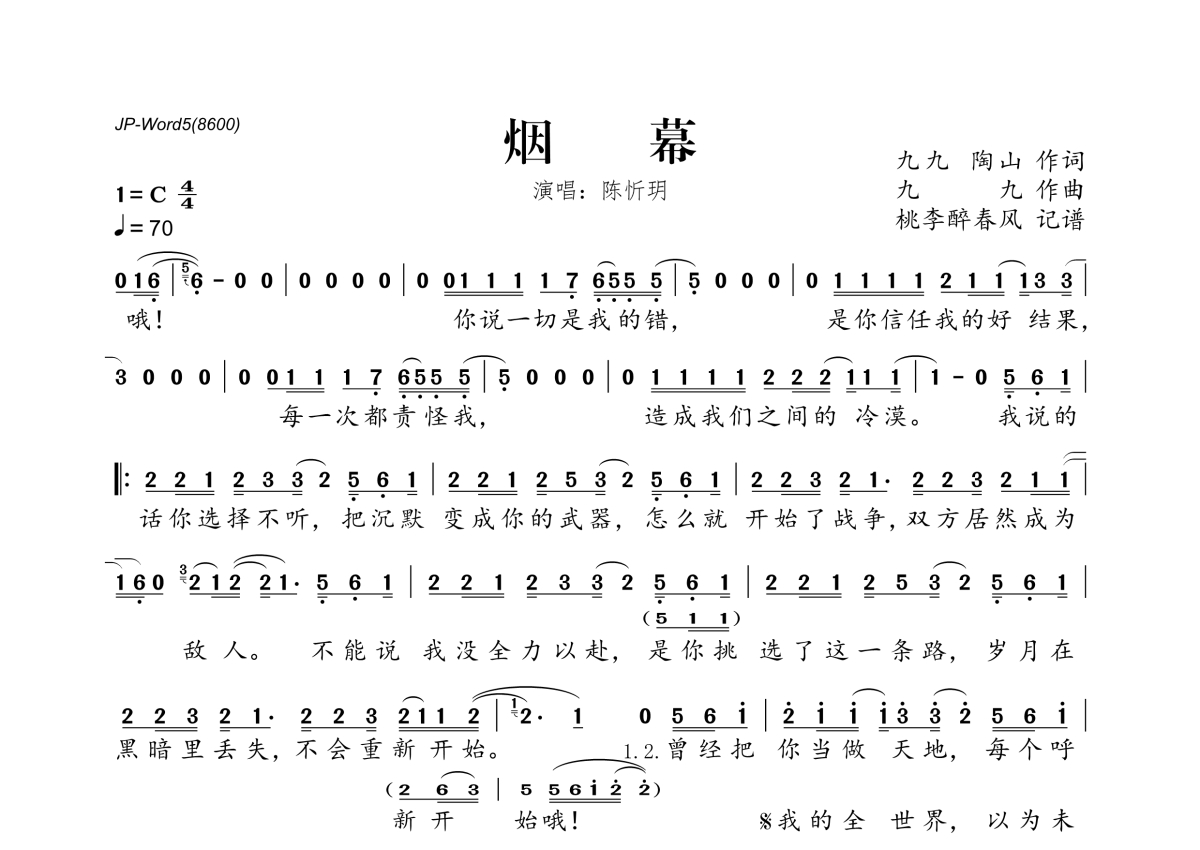 烟幕简谱 - 陈忻玥演唱