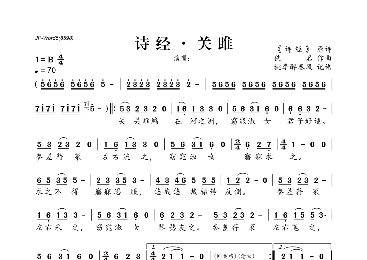 《诗经·关雎》是佚名演唱的一首歌曲,拍号为4/4拍,歌曲速度为每分钟70拍,歌曲原调为B调,这份简谱共有一张高清图谱,图谱由 @桃李醉春风 编配上传。