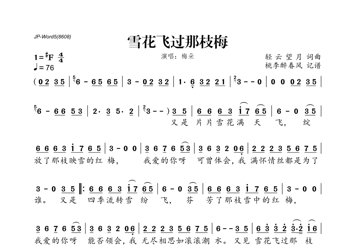 《雪花飞过那枝梅》是梅朵演唱的一首歌曲,拍号为4/4拍,歌曲速度为每分钟76拍,歌曲原调为F调,这份简谱共有一张高清图谱,图谱由 @桃李醉春风 编配上传。