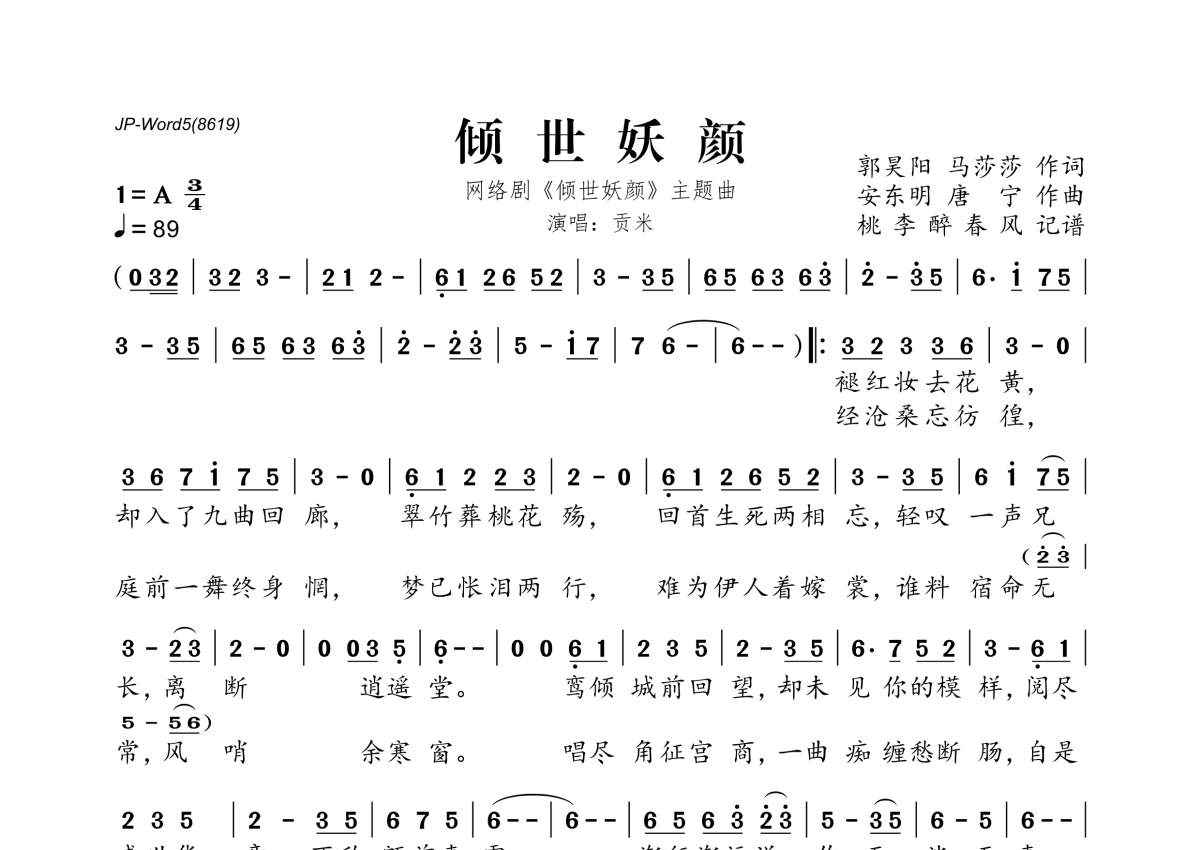 《倾世妖颜》是贡米演唱的一首歌曲,拍号为3/4拍,歌曲速度为每分钟89拍,歌曲原调为A调,这份简谱共有一张高清图谱,图谱由 @桃李醉春风 编配上传。