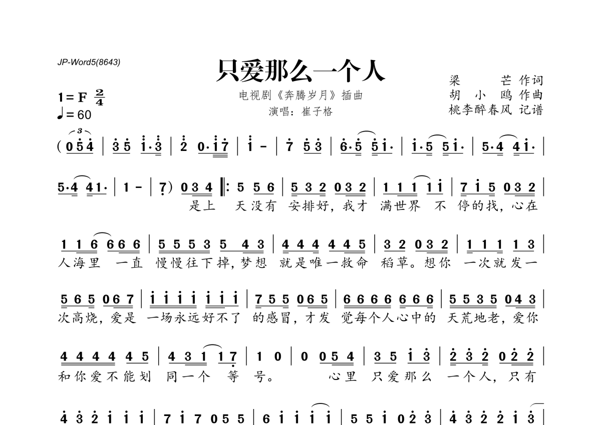 《只爱那么一个人》是崔子格演唱的一首歌曲,拍号为2/4拍,歌曲速度为每分钟60拍,歌曲原调为F调,这份简谱共有一张高清图谱,图谱由 @桃李醉春风 编配上传。
