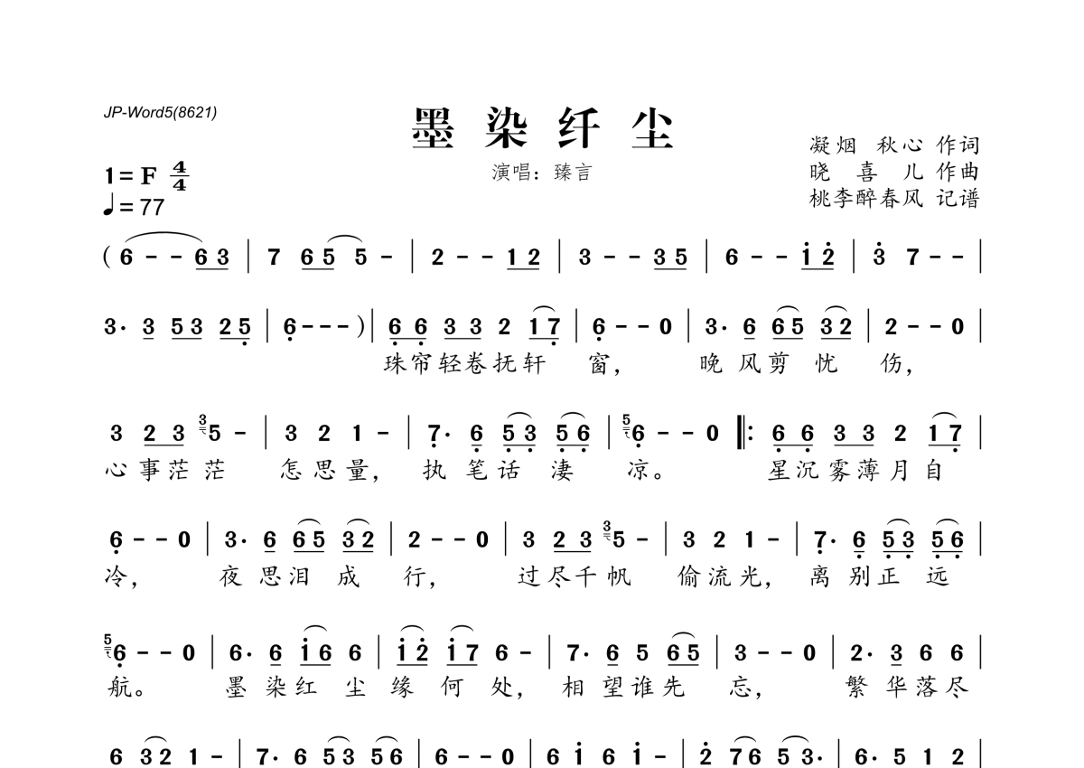 《墨染纤尘》是臻言演唱的一首歌曲,拍号为4/4拍,歌曲速度为每分钟77拍,歌曲原调为F调,这份简谱共有一张高清图谱,图谱由 @桃李醉春风 编配上传。