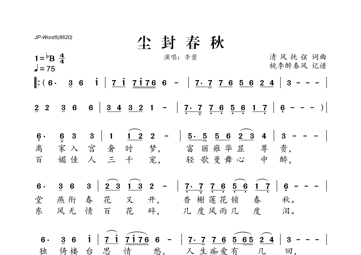 《尘封春秋》是李萱演唱的一首歌曲,拍号为4/4拍,歌曲速度为每分钟75拍,歌曲原调为Bb调,这份简谱共有一张高清图谱,图谱由 @桃李醉春风 编配上传。
