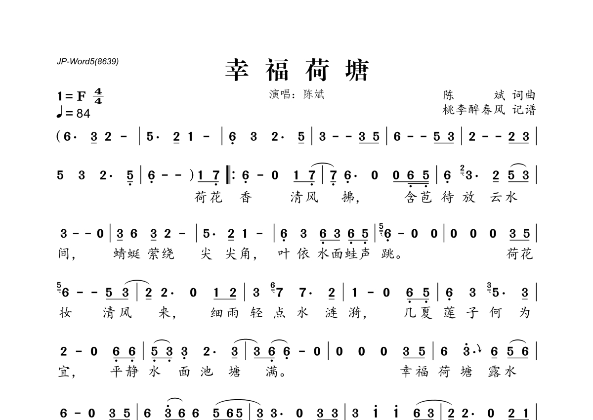《幸福荷塘》是陈斌演唱的一首歌曲,拍号为4/4拍,歌曲速度为每分钟84拍,这份简谱共有一张高清图谱,图谱由 @桃李醉春风 编配上传。
