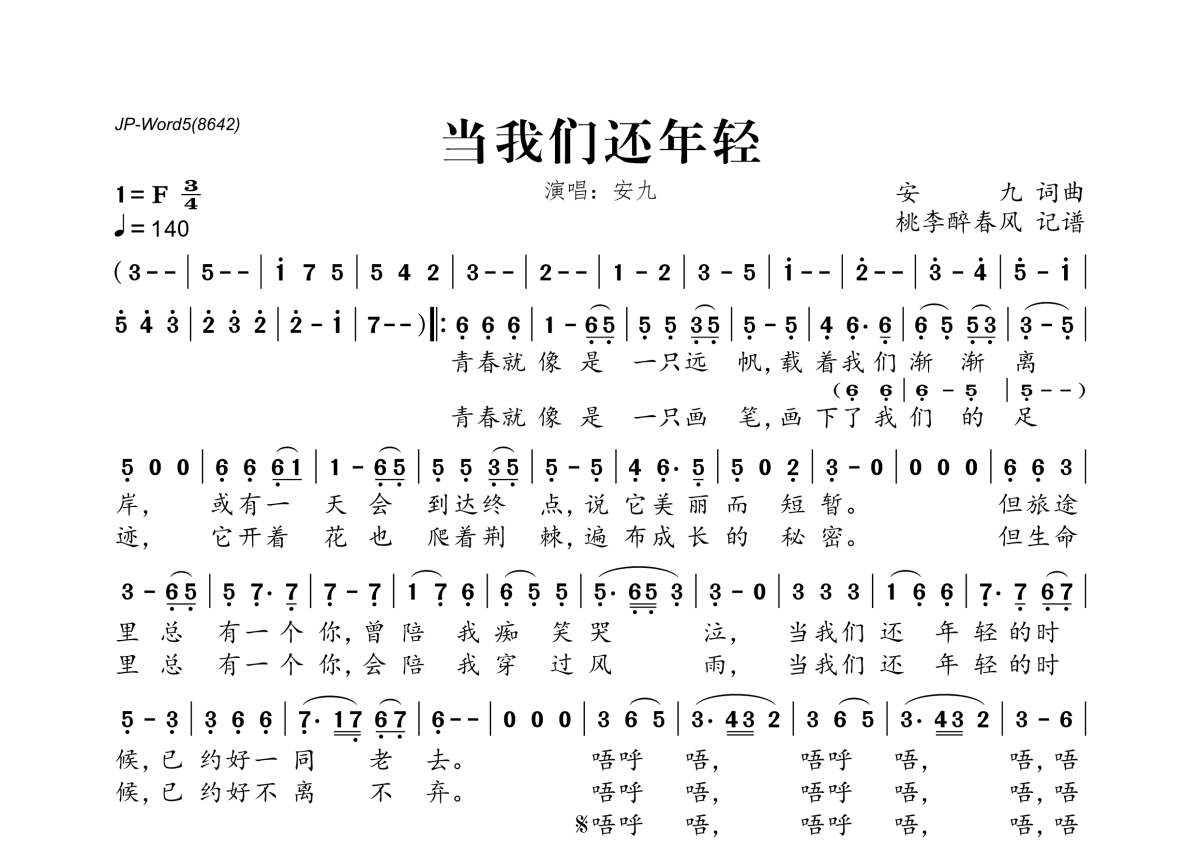 《当我们还年轻》是安九演唱的一首歌曲,拍号为3/4拍,歌曲速度为每分钟140拍,这份简谱共有一张高清图谱,图谱由 @桃李醉春风 编配上传。