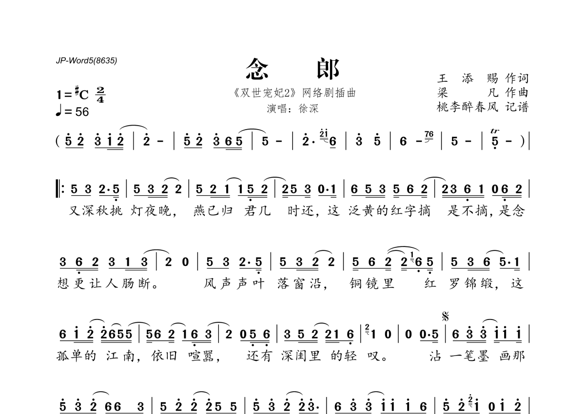 《念郎》是徐深演唱的一首歌曲,拍号为2/4拍,歌曲速度为每分钟56拍,这份简谱共有一张高清图谱,图谱由 @桃李醉春风 编配上传。