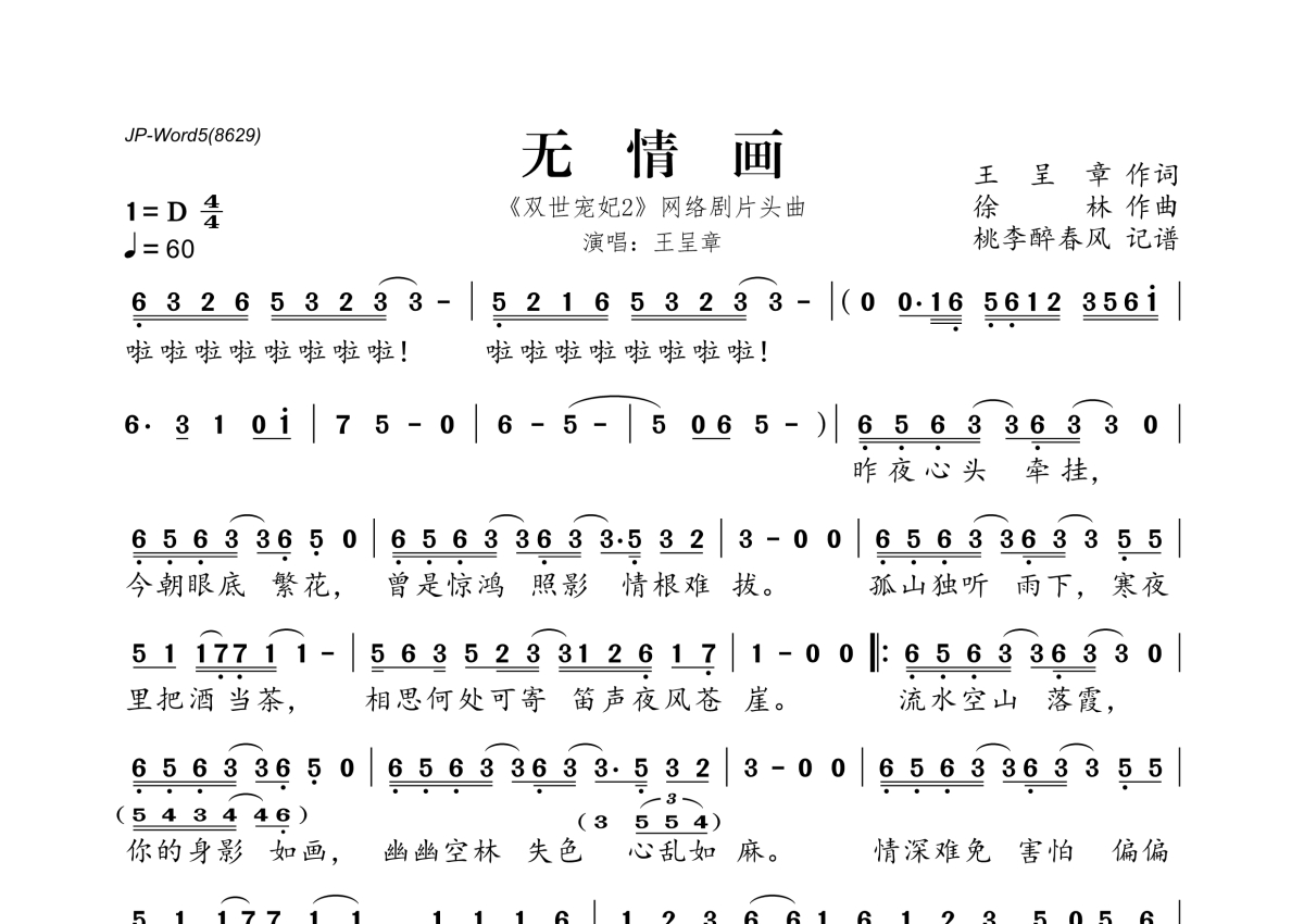 《无情画》是王呈章演唱的一首歌曲,拍号为4/4拍,歌曲速度为每分钟60拍,这份简谱共有一张高清图谱,图谱由 @桃李醉春风 编配上传。