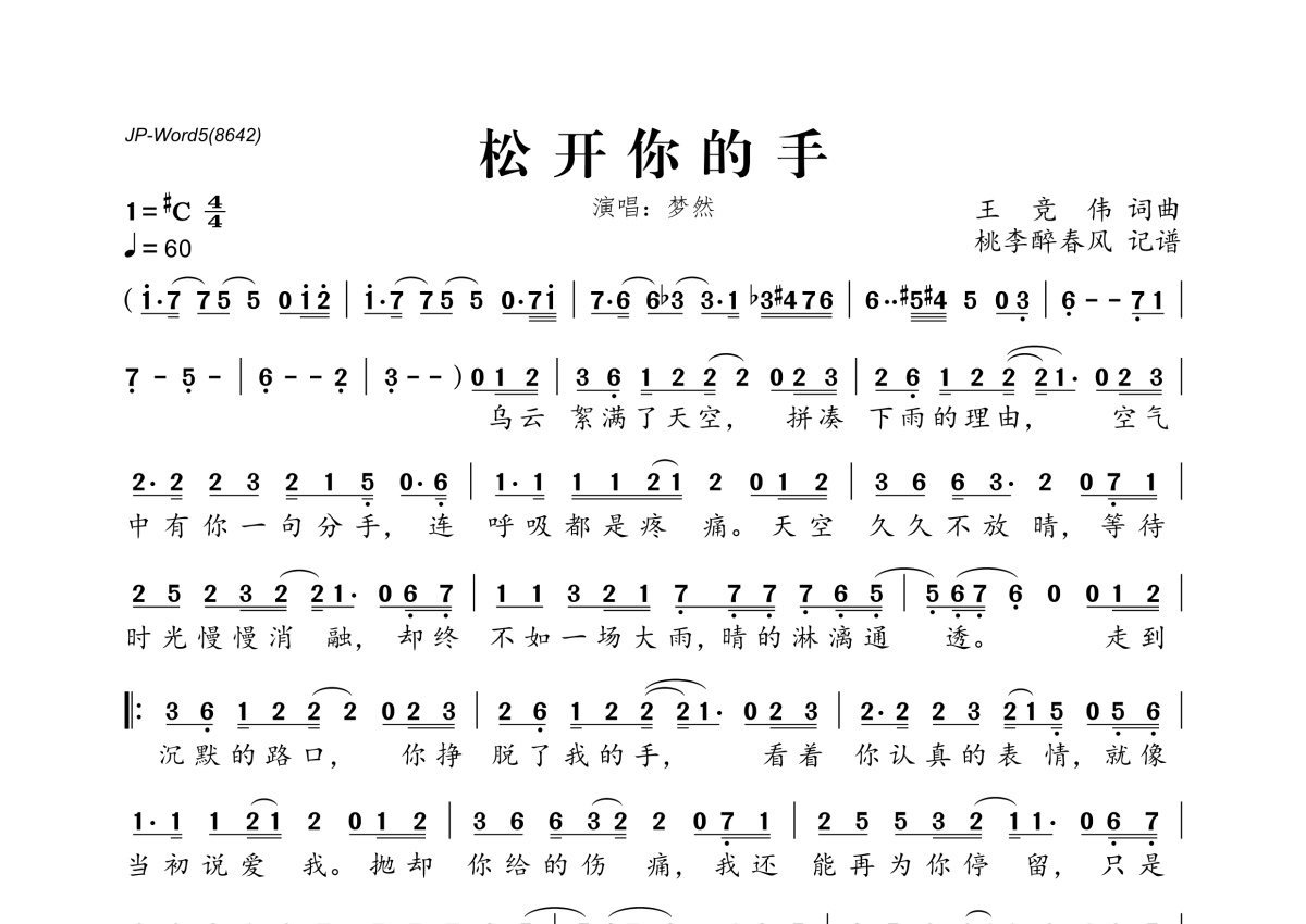《松开你的手》是梦然演唱的一首歌曲,拍号为4/4拍,歌曲速度为每分钟60拍,这份简谱共有一张高清图谱,图谱由 @桃李醉春风 编配上传。