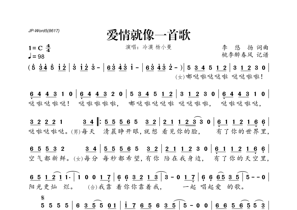 《爱情就像一首歌》是冷漠&杨小曼演唱的一首歌曲,拍号为4/4拍,歌曲速度为每分钟98拍,这份简谱共有一张高清图谱,图谱由 @桃李醉春风 编配上传。