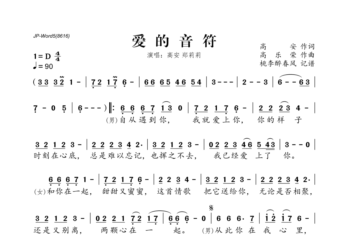 《爱的音符》是高安&郑莉莉演唱的一首歌曲,拍号为4/4拍,歌曲速度为每分钟90拍,这份简谱共有一张高清图谱,图谱由 @桃李醉春风 编配上传。