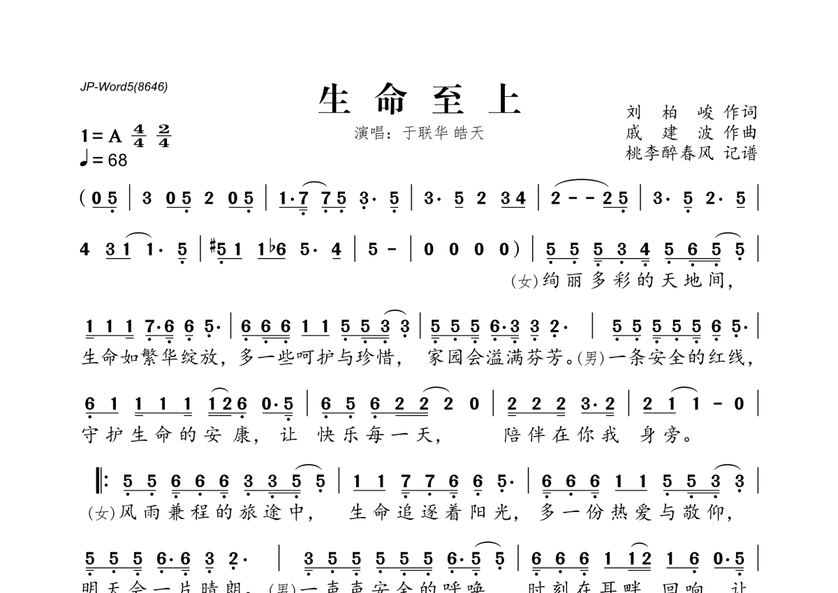 《生命至上》是于联华&皓天演唱的一首歌曲,拍号为4/4拍,歌曲速度为每分钟68拍,这份简谱共有一张高清图谱,图谱由 @桃李醉春风 编配上传。