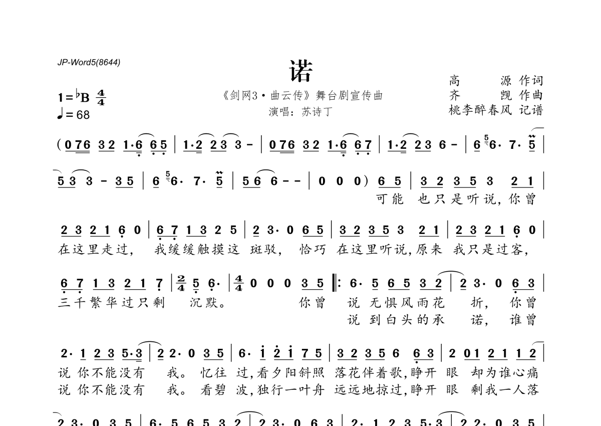 《诺》是苏诗丁演唱的一首歌曲,拍号为4/4拍,歌曲速度为每分钟68拍,这份简谱共有一张高清图谱,图谱由 @桃李醉春风 编配上传。