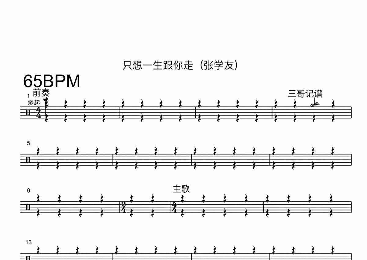 《只想一生跟你走》是张学友演唱的一首歌曲,这份鼓谱共有三张高清图谱,图谱由 @打鼓谱 编配上传,图谱使用五线谱编配,使用这份只想一生跟你走架子鼓谱,你将能够轻松地敲打出这首张学友的只想一生跟你走,快来尝试吧。《只想一生跟你走》是张学友演唱的粤语歌曲,由刘卓辉作词,巫启贤作曲,赵增熹编曲,收录在张学友1993年7月24日发行的粤语专辑《我与你》。