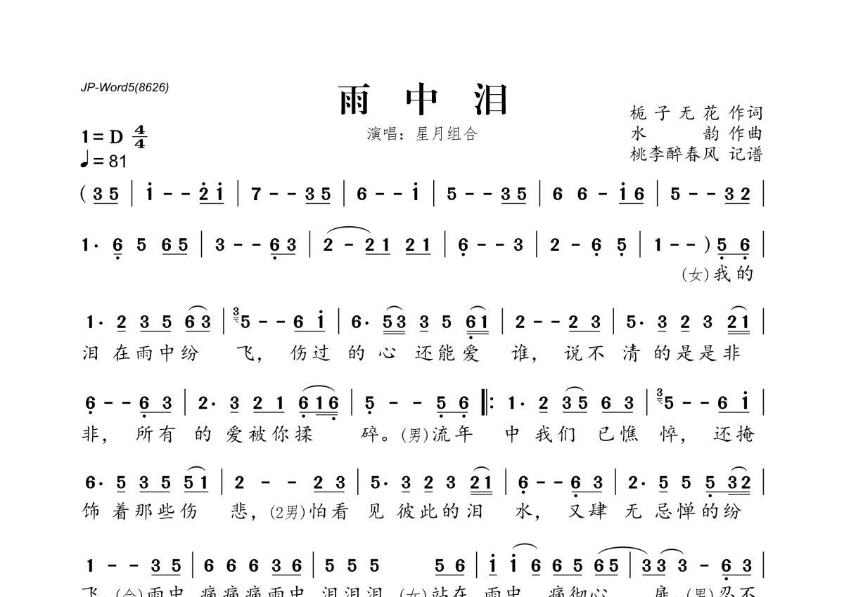 《雨中泪》是星月组合演唱的一首歌曲,拍号为4/4拍,这份简谱共有一张高清图谱,图谱由 @桃李醉春风 编配上传。