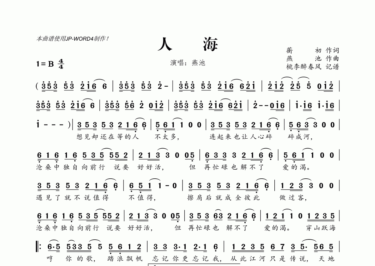 《人海》是燕池演唱的一首歌曲,拍号为4/4拍,这份简谱共有一张高清图谱,图谱由 @桃李醉春风 编配上传。