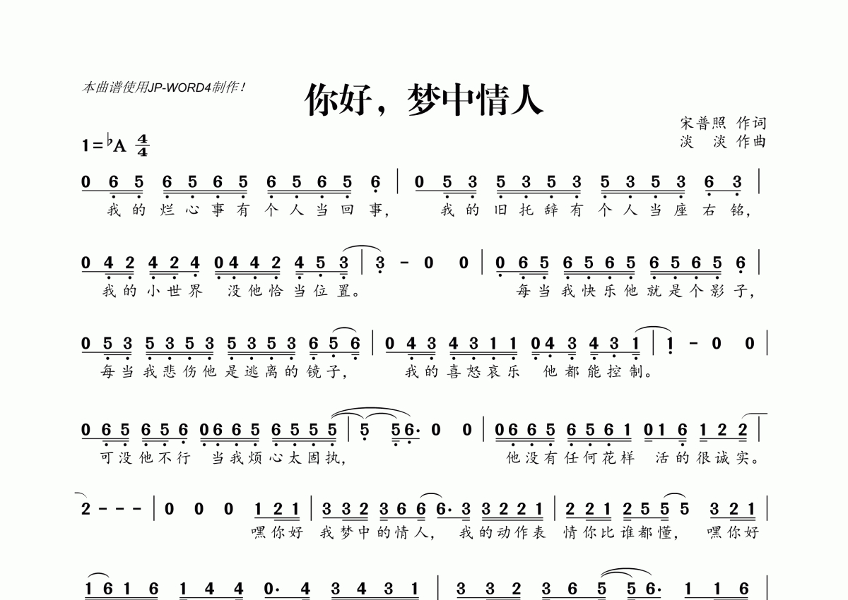《你好,梦中情人》,拍号为4/4拍,这份简谱共有一张高清图谱,图谱由 @桃李醉春风 编配上传。