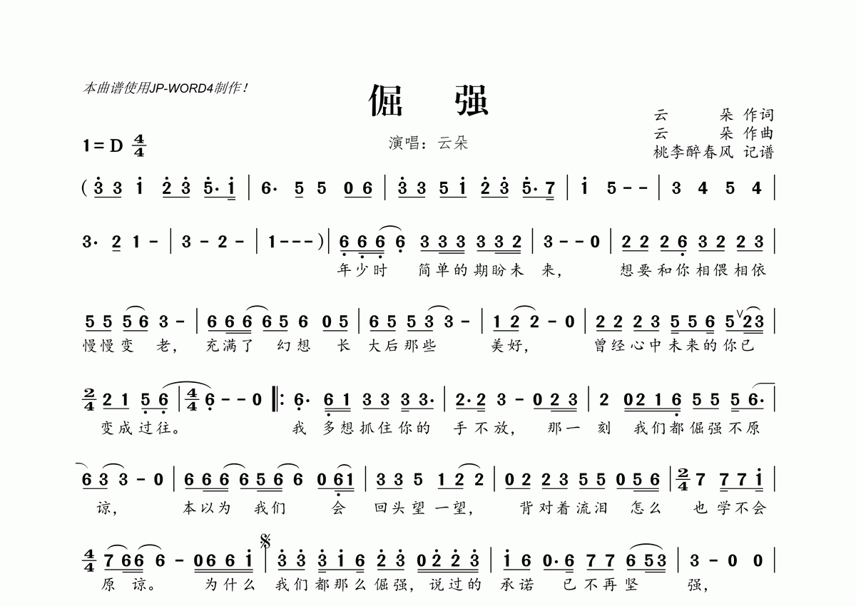 《倔强》是云朵演唱的一首歌曲,拍号为4/4拍,这份简谱共有一张高清图谱,图谱由 @桃李醉春风 编配上传。