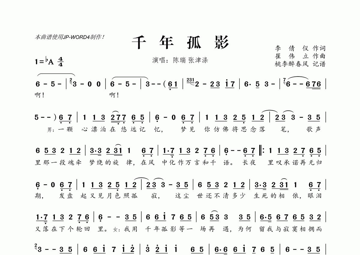 《千年孤影》是陈瑞&张津涤演唱的一首歌曲,拍号为4/4拍,这份简谱共有一张高清图谱,图谱由 @桃李醉春风 编配上传。