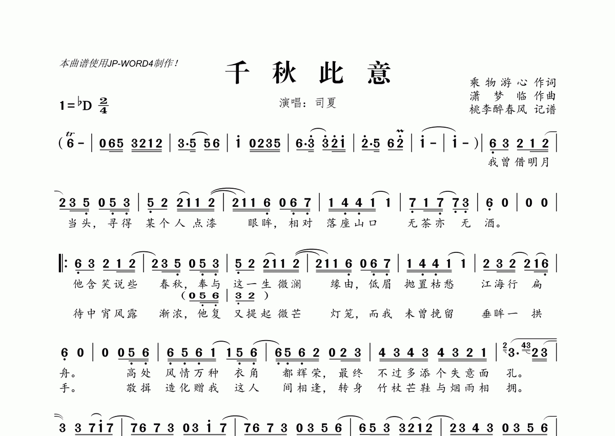 《千秋此意》是司夏演唱的一首歌曲,拍号为2/4拍,这份简谱共有一张高清图谱,图谱由 @桃李醉春风 编配上传。