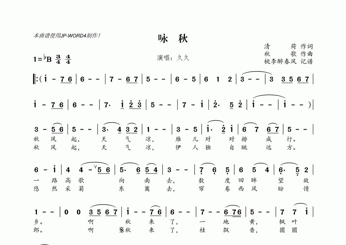 《咏秋》是久久演唱的一首歌曲,拍号为4/4拍,这份简谱共有一张高清图谱,图谱由 @桃李醉春风 编配上传。