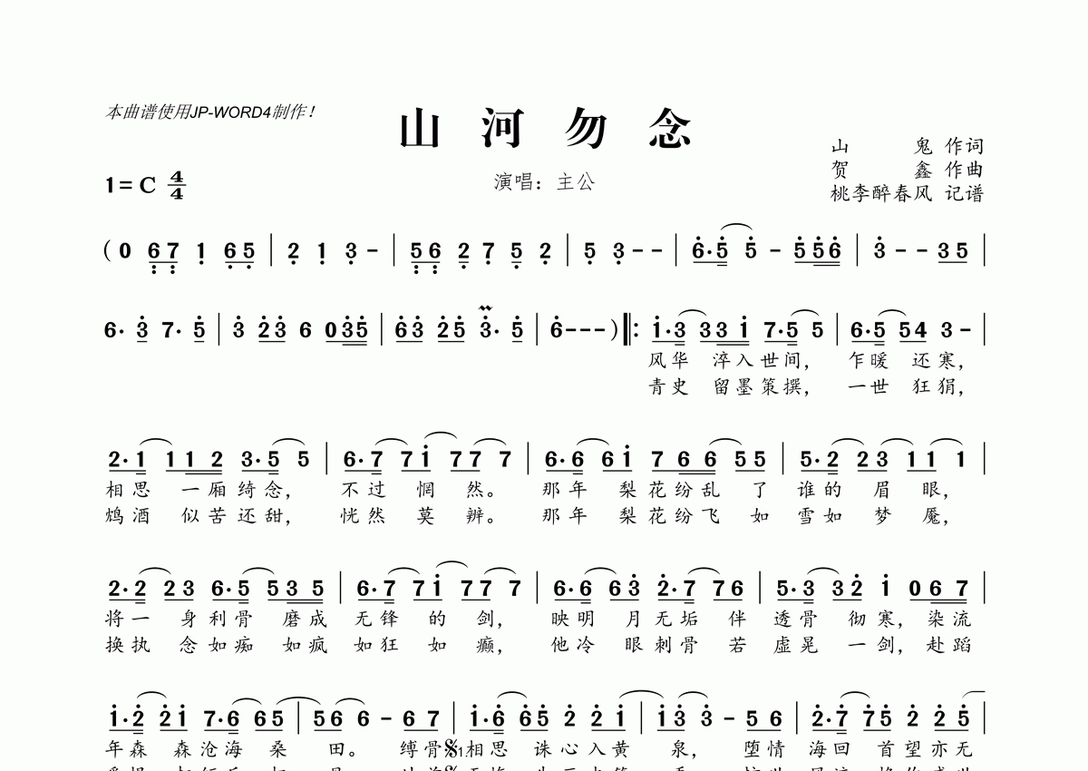 《山河勿念》是主公演唱的一首歌曲,拍号为4/4拍,这份简谱共有一张高清图谱,图谱由 @桃李醉春风 编配上传。