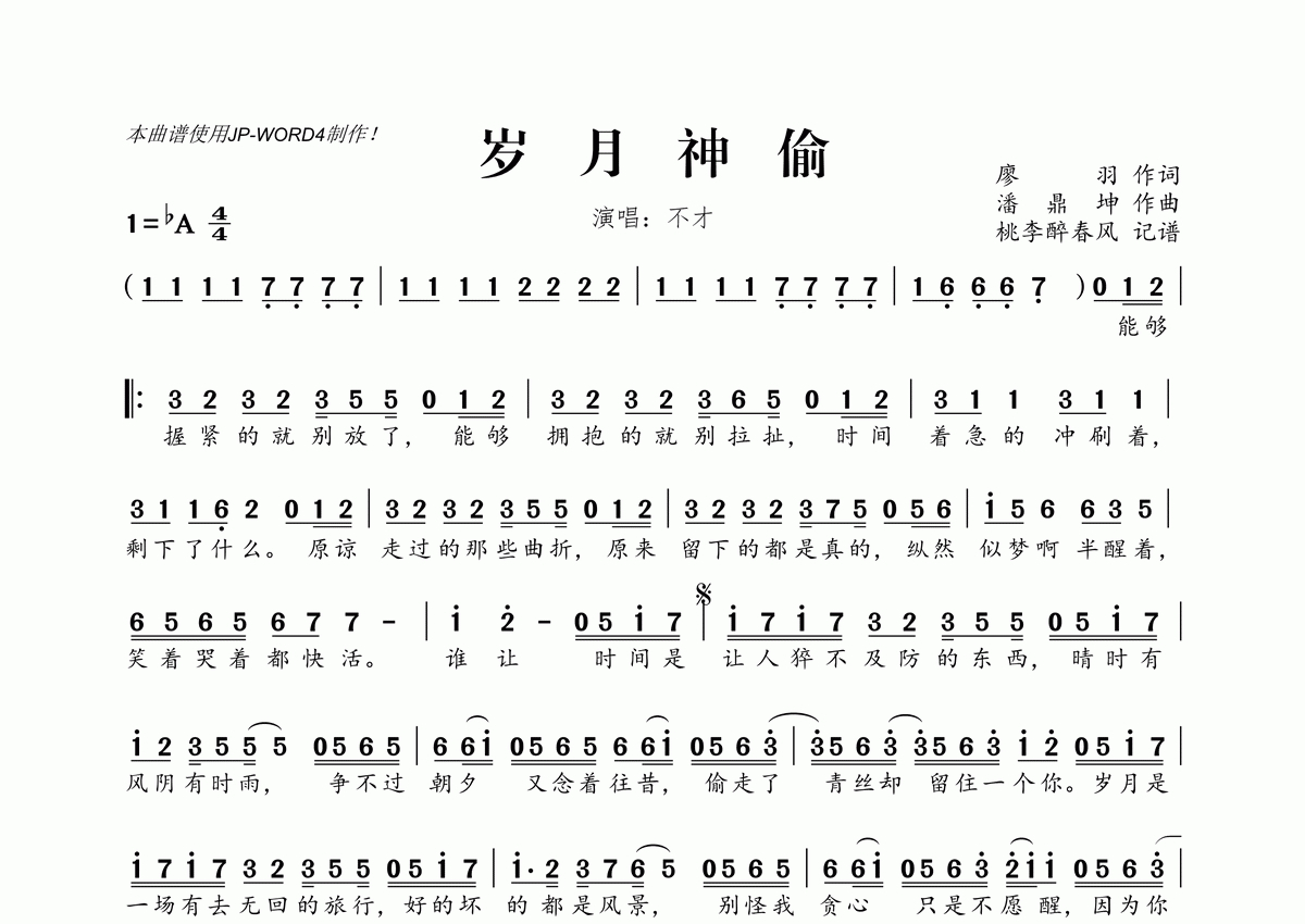 《岁月神偷》是不才演唱的一首歌曲,拍号为4/4拍,这份简谱共有一张高清图谱,图谱由 @桃李醉春风 编配上传。