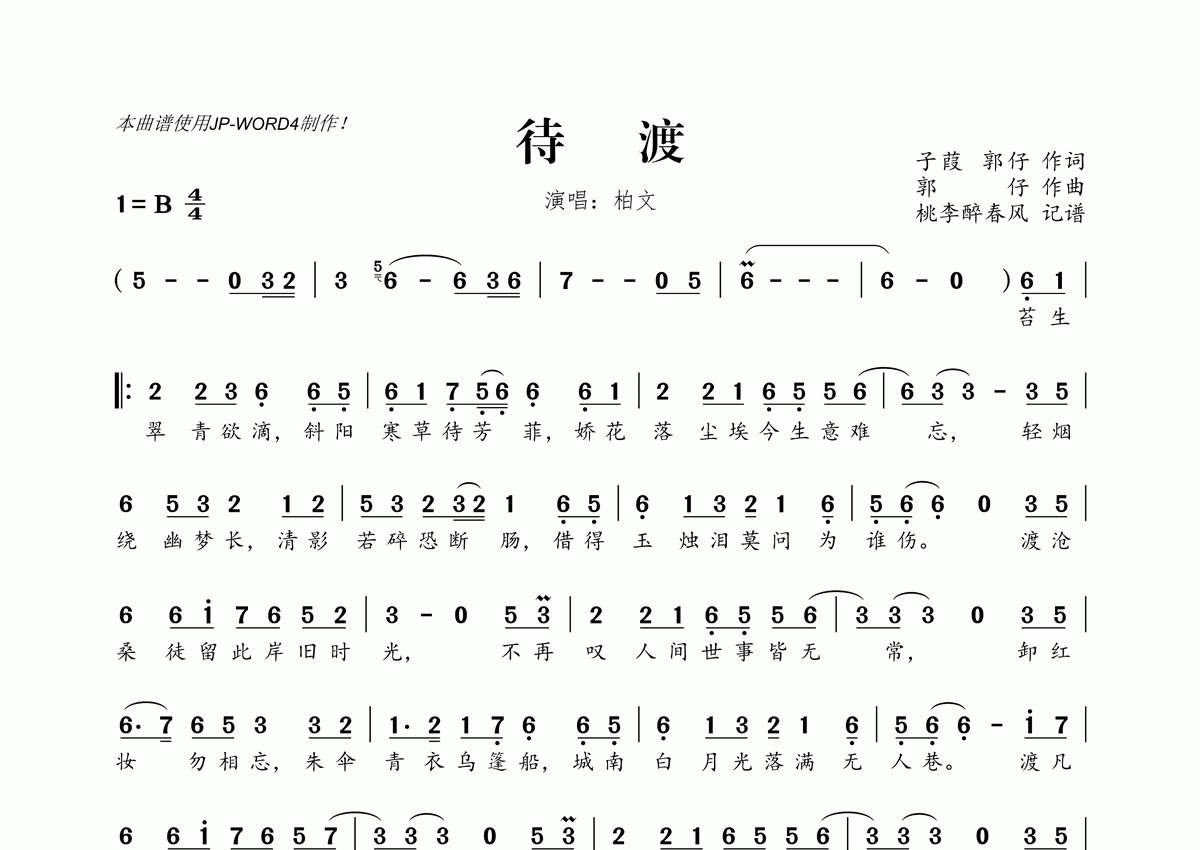 《待渡》是柏文演唱的一首歌曲,拍号为4/4拍,这份简谱共有一张高清图谱,图谱由 @桃李醉春风 编配上传。