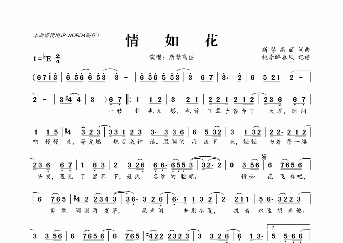 《情如花》是斯琴高丽演唱的一首歌曲,拍号为2/4拍,这份简谱共有一张高清图谱,图谱由 @桃李醉春风 编配上传。
