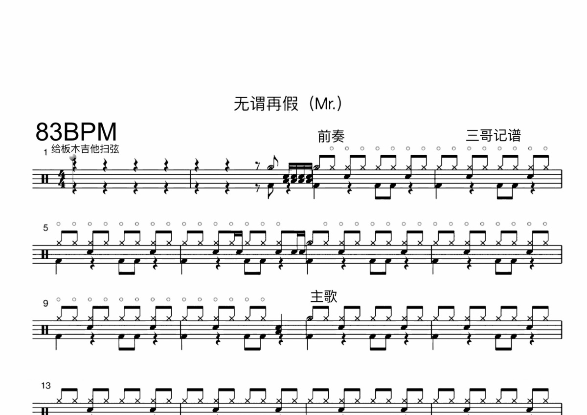 《无谓再假》是Mr.演唱的一首歌曲,这份鼓谱共有三张高清图谱,图谱由 @打鼓谱 编配上传,图谱使用五线谱编配,使用这份无谓再假架子鼓谱,你将能够轻松地敲打出这首Mr.的无谓再假,快来尝试吧。无谓再假是著名乐队Mr.的作品之一,由ALAN PO,TOM作曲。
