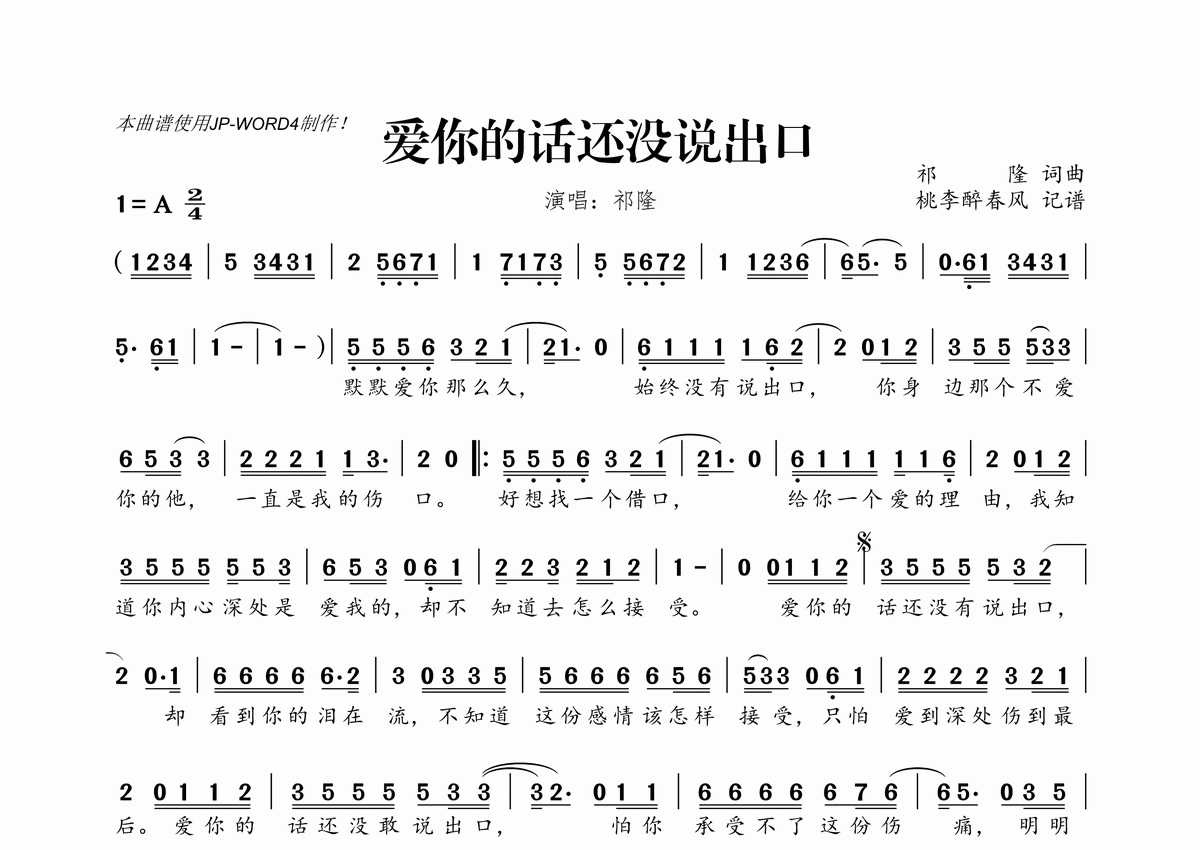 《爱你的话还没说出口》是祁隆演唱的一首歌曲,拍号为2/4拍,这份简谱共有一张高清图谱,图谱由 @桃李醉春风 编配上传。