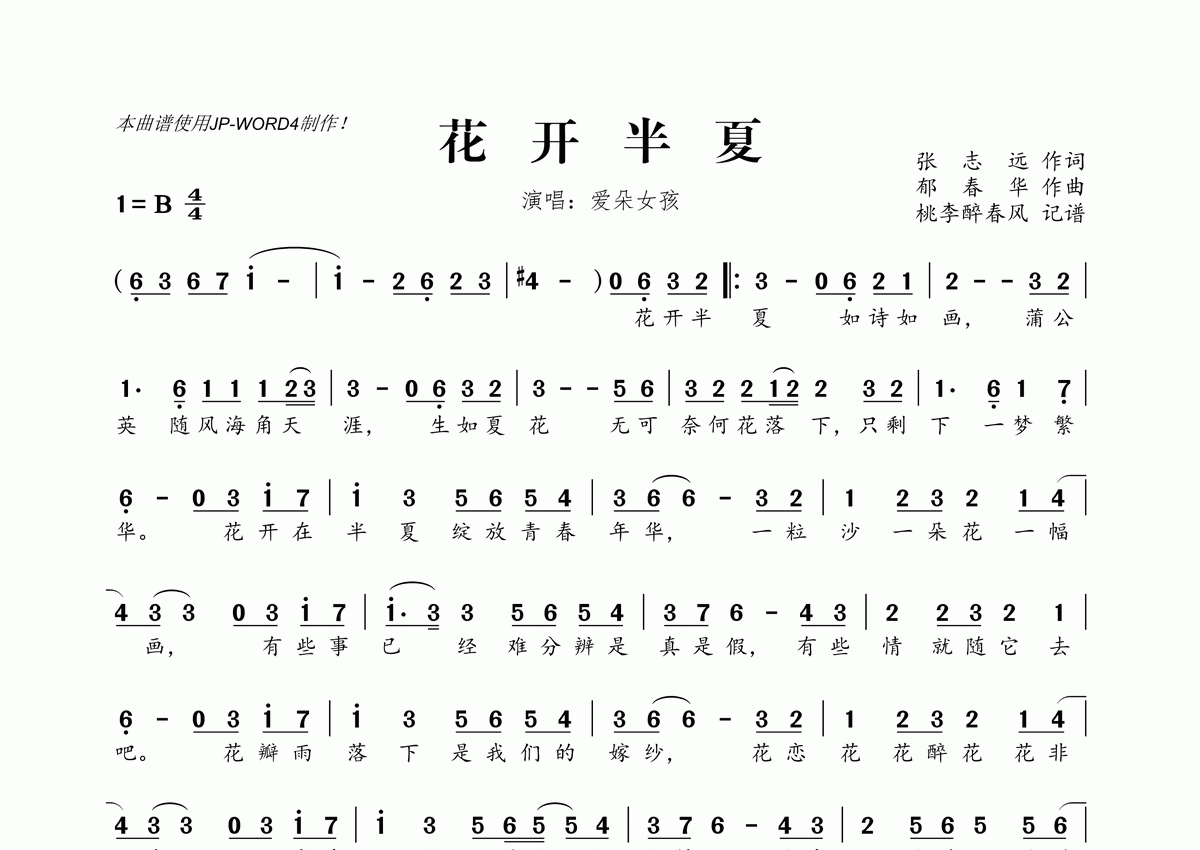 《花开半夏》是爱朵女孩演唱的一首歌曲,拍号为4/4拍,这份简谱共有一张高清图谱,图谱由 @桃李醉春风 编配上传。