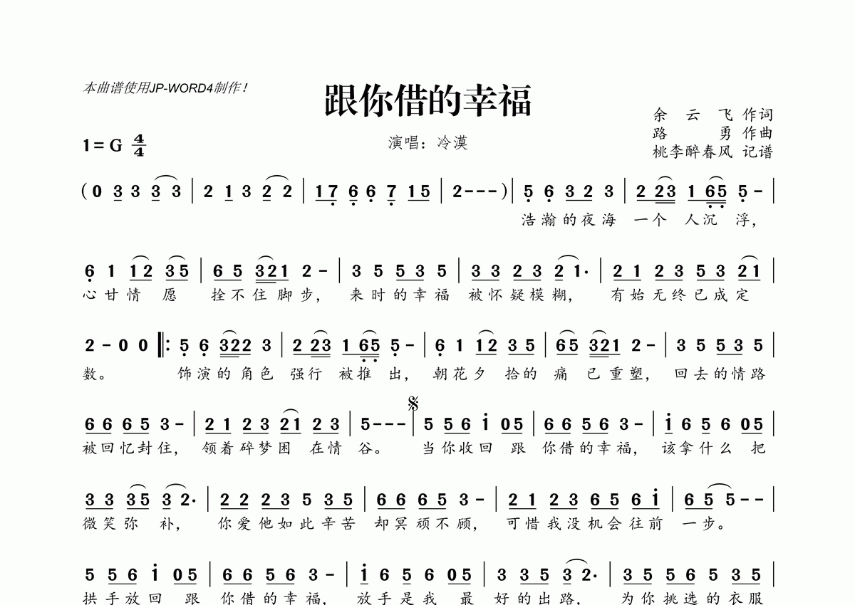 《跟你借的幸福》是冷漠演唱的一首歌曲,拍号为4/4拍,这份简谱共有一张高清图谱,图谱由 @桃李醉春风 编配上传。