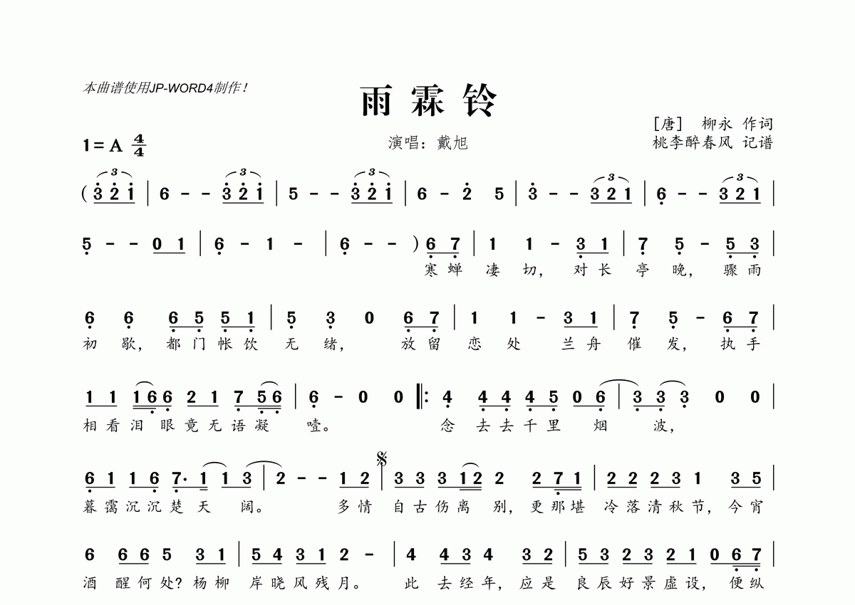 《雨铃霖》是戴旭演唱的一首歌曲,拍号为4/4拍,这份简谱共有一张高清图谱,图谱由 @桃李醉春风 编配上传。
