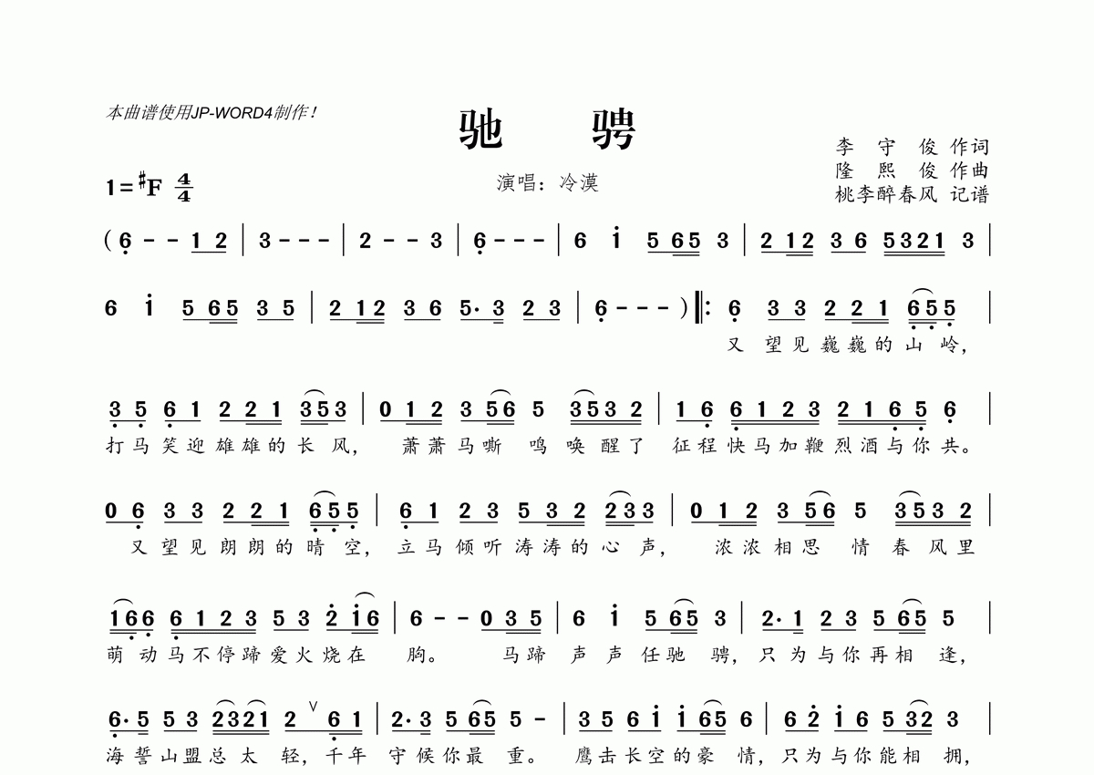 《驰骋》是冷漠演唱的一首歌曲,拍号为4/4拍,这份简谱共有一张高清图谱,图谱由 @桃李醉春风 编配上传。