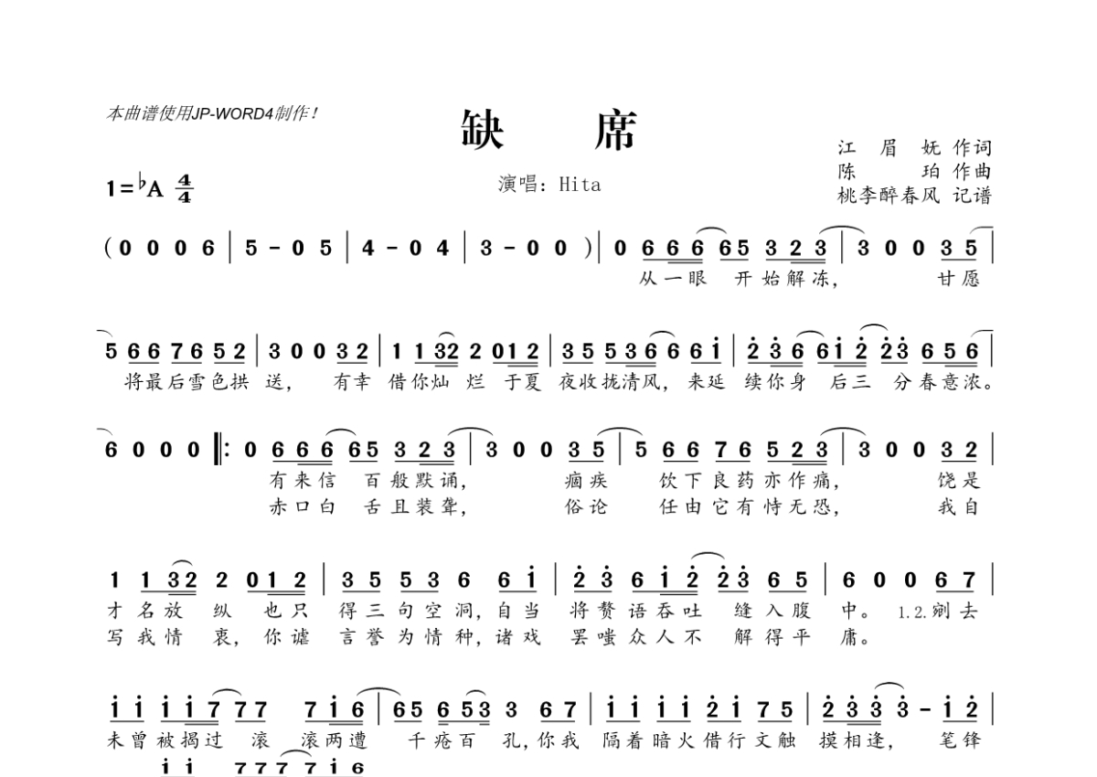《缺席》是Hita演唱的一首歌曲,拍号为4/4拍,这份简谱共有一张高清图谱,图谱由 @桃李醉春风 编配上传。