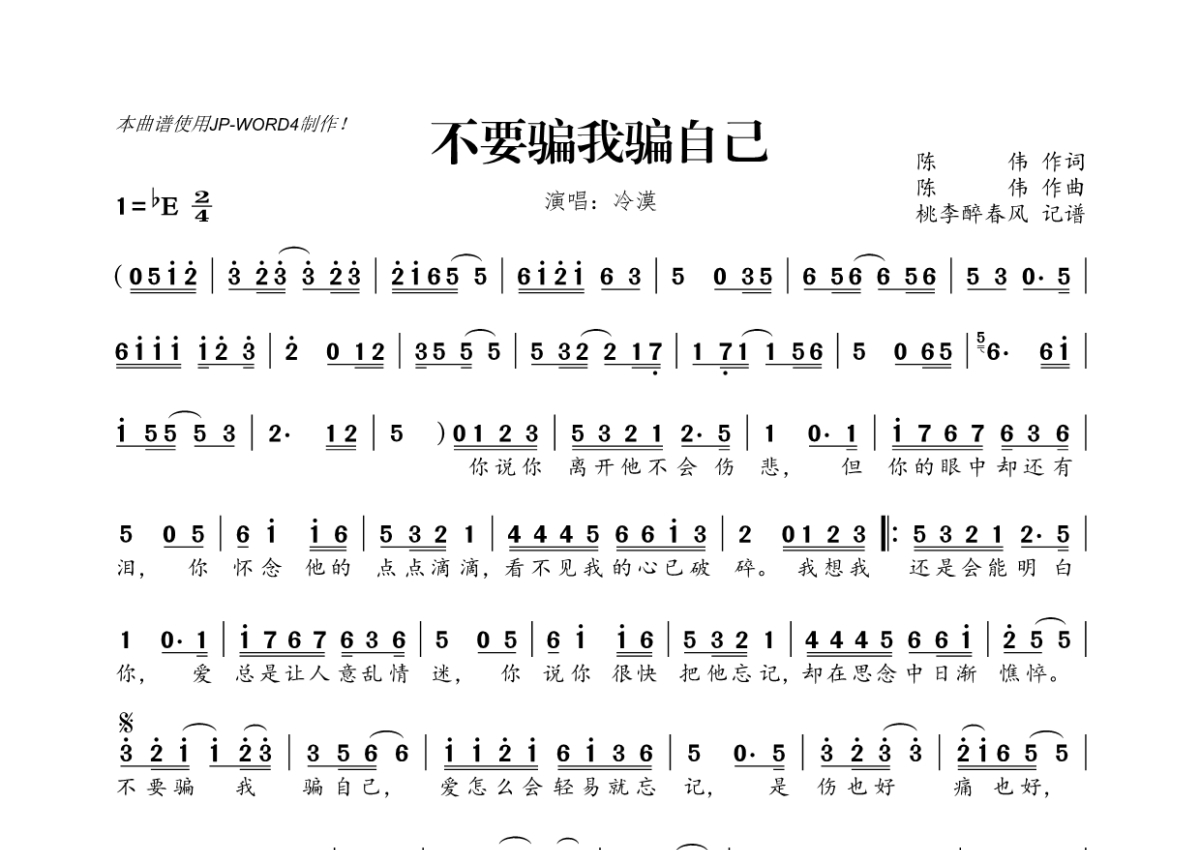 《不要骗我骗自己》是冷漠演唱的一首歌曲,拍号为2/4拍,这份简谱共有一张高清图谱,图谱由 @桃李醉春风 编配上传。