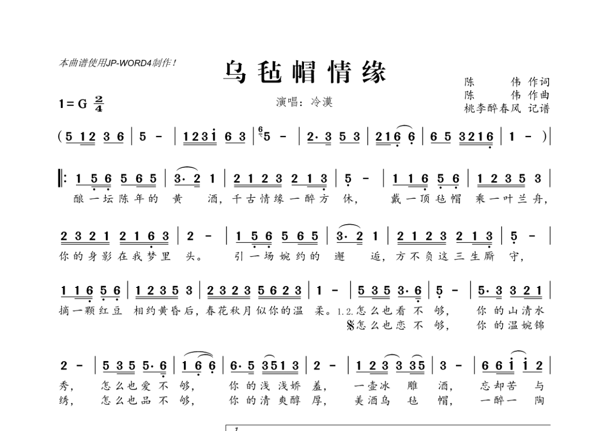 《乌毡帽情缘》是冷漠演唱的一首歌曲,拍号为2/4拍,这份简谱共有一张高清图谱,图谱由 @桃李醉春风 编配上传。