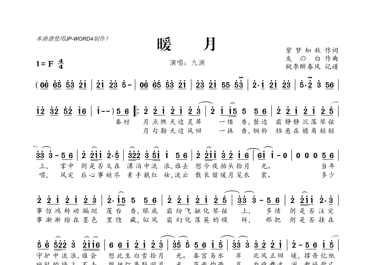 《暖月》是九渊演唱的一首歌曲,拍号为4/4拍,这份简谱共有一张高清图谱,图谱由 @桃李醉春风 编配上传。