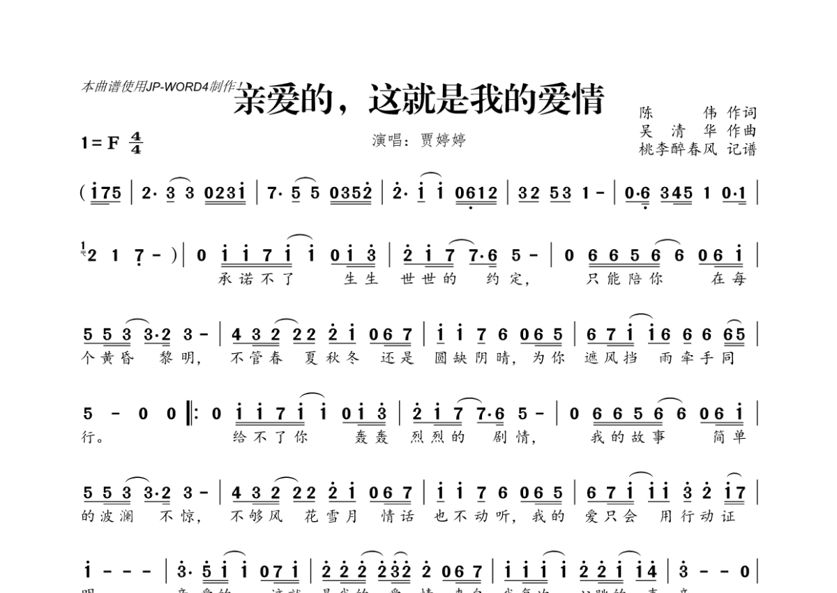 《亲爱的这就是我的爱情》是贾婷婷演唱的一首歌曲,拍号为4/4拍,这份简谱共有一张高清图谱,图谱由 @桃李醉春风 编配上传。