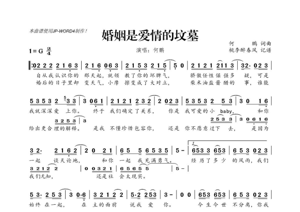 《婚姻是爱情的坟墓》是何鹏演唱的一首歌曲,拍号为2/4拍,这份简谱共有一张高清图谱,图谱由 @桃李醉春风 编配上传。