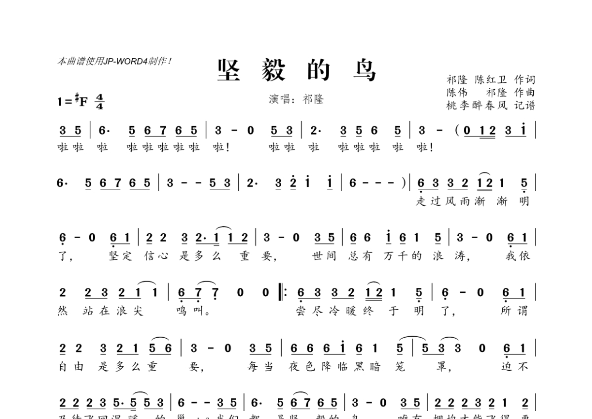 《坚毅的鸟》是祁隆演唱的一首歌曲,拍号为4/4拍,这份简谱共有一张高清图谱,图谱由 @桃李醉春风 编配上传。