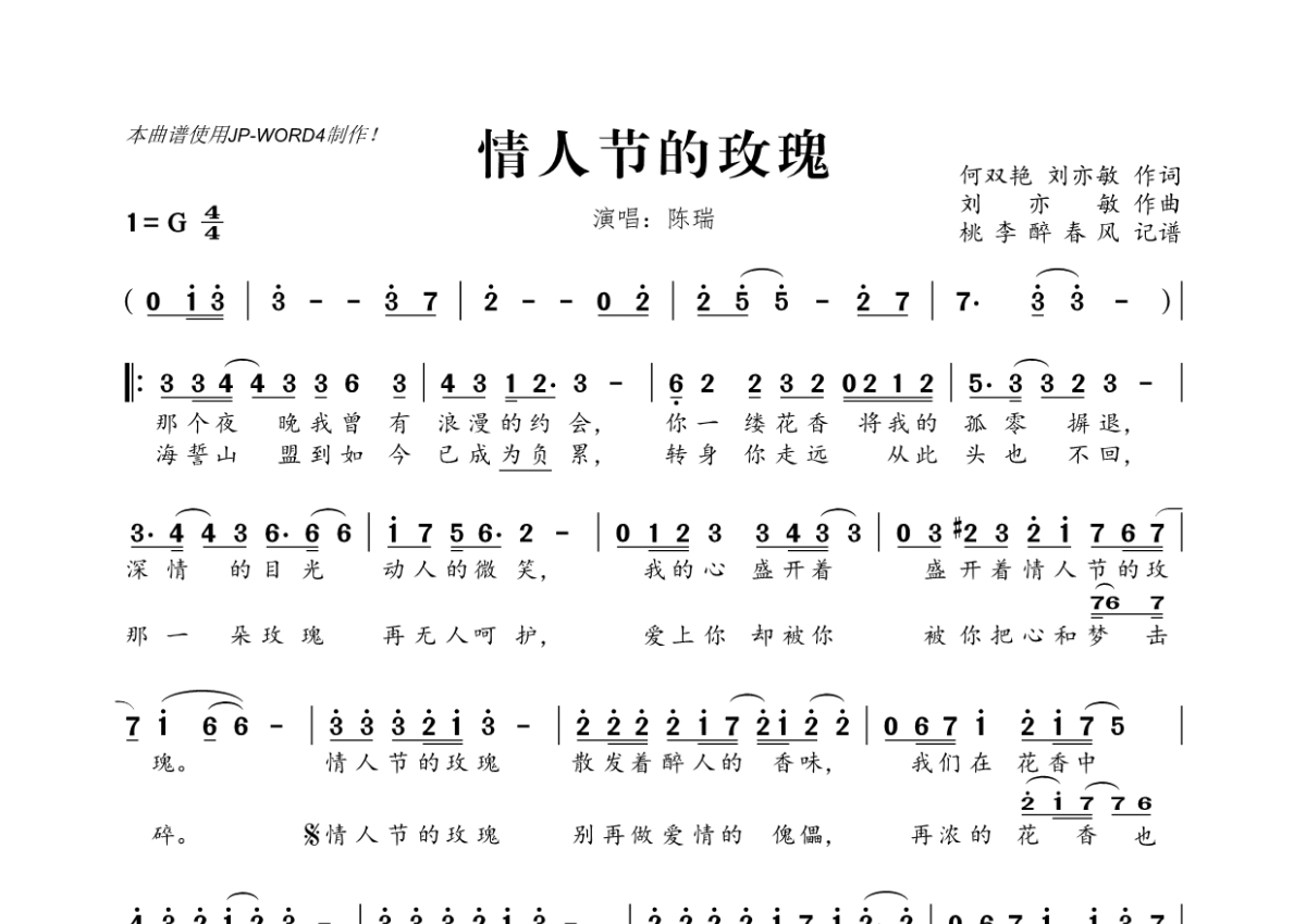 《情人节的玫瑰》是陈瑞演唱的一首歌曲,拍号为4/4拍,这份简谱共有一张高清图谱,图谱由 @桃李醉春风 编配上传。