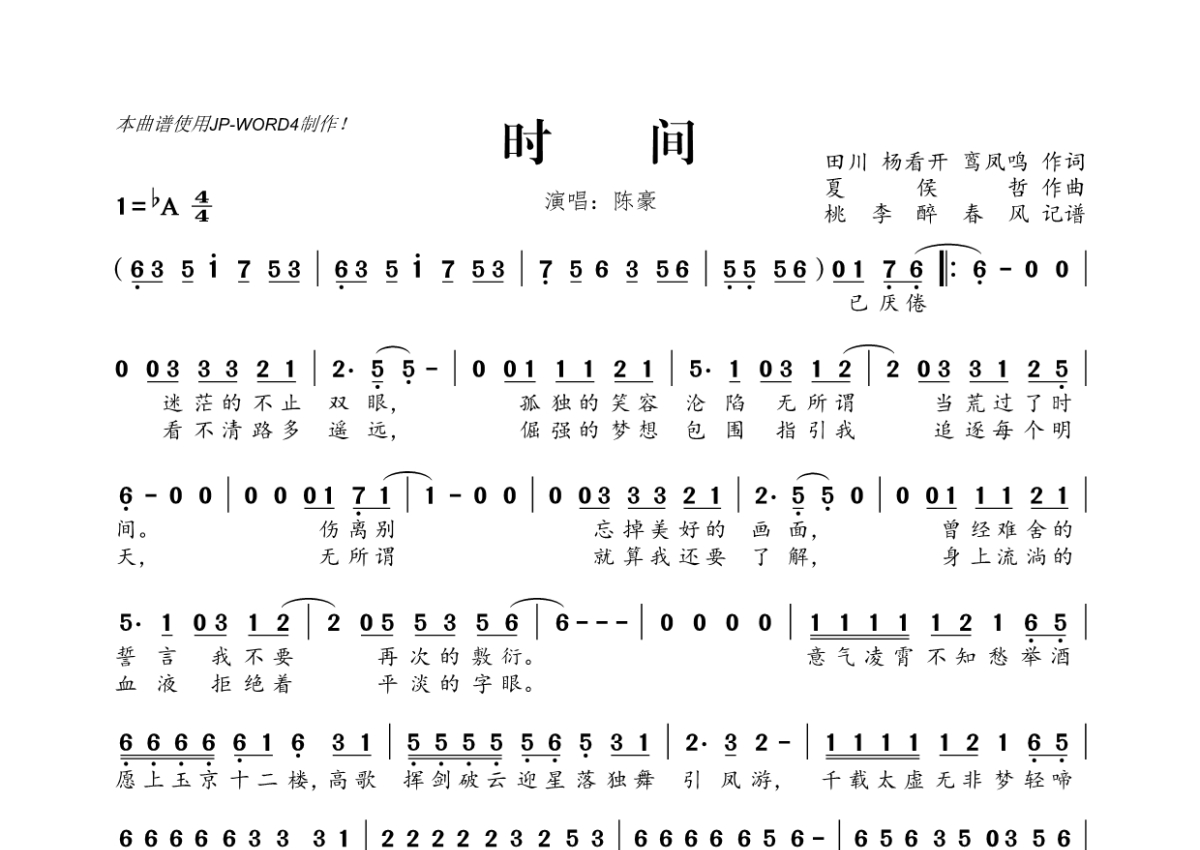 《时间》是陈豪演唱的一首歌曲,拍号为4/4拍,这份简谱共有一张高清图谱,图谱由 @桃李醉春风 编配上传。