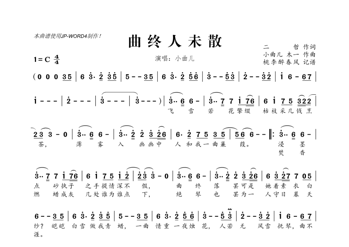 《曲终人未散》是小曲儿演唱的一首歌曲,拍号为4/4拍,这份简谱共有一张高清图谱,图谱由 @桃李醉春风 编配上传。
