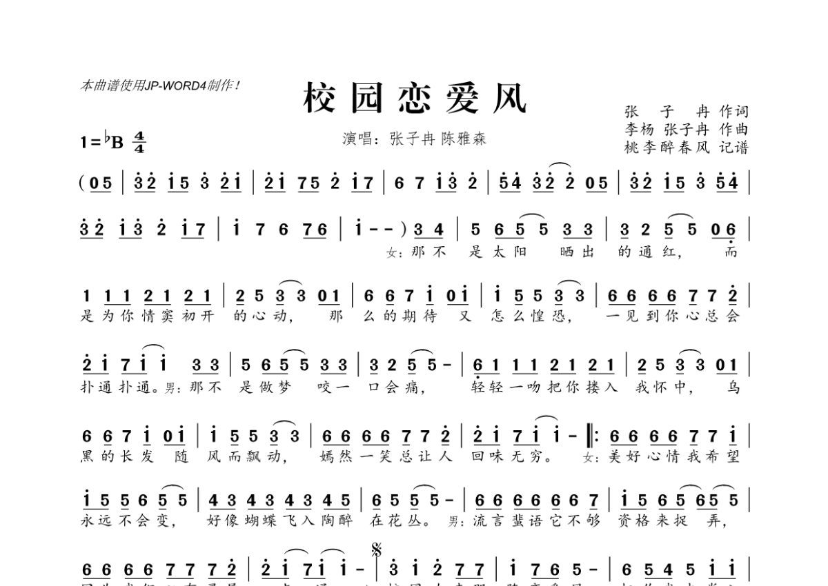 《校园恋爱风》是张子冉演唱的一首歌曲,拍号为4/4拍,这份简谱共有一张高清图谱,图谱由 @桃李醉春风 编配上传。