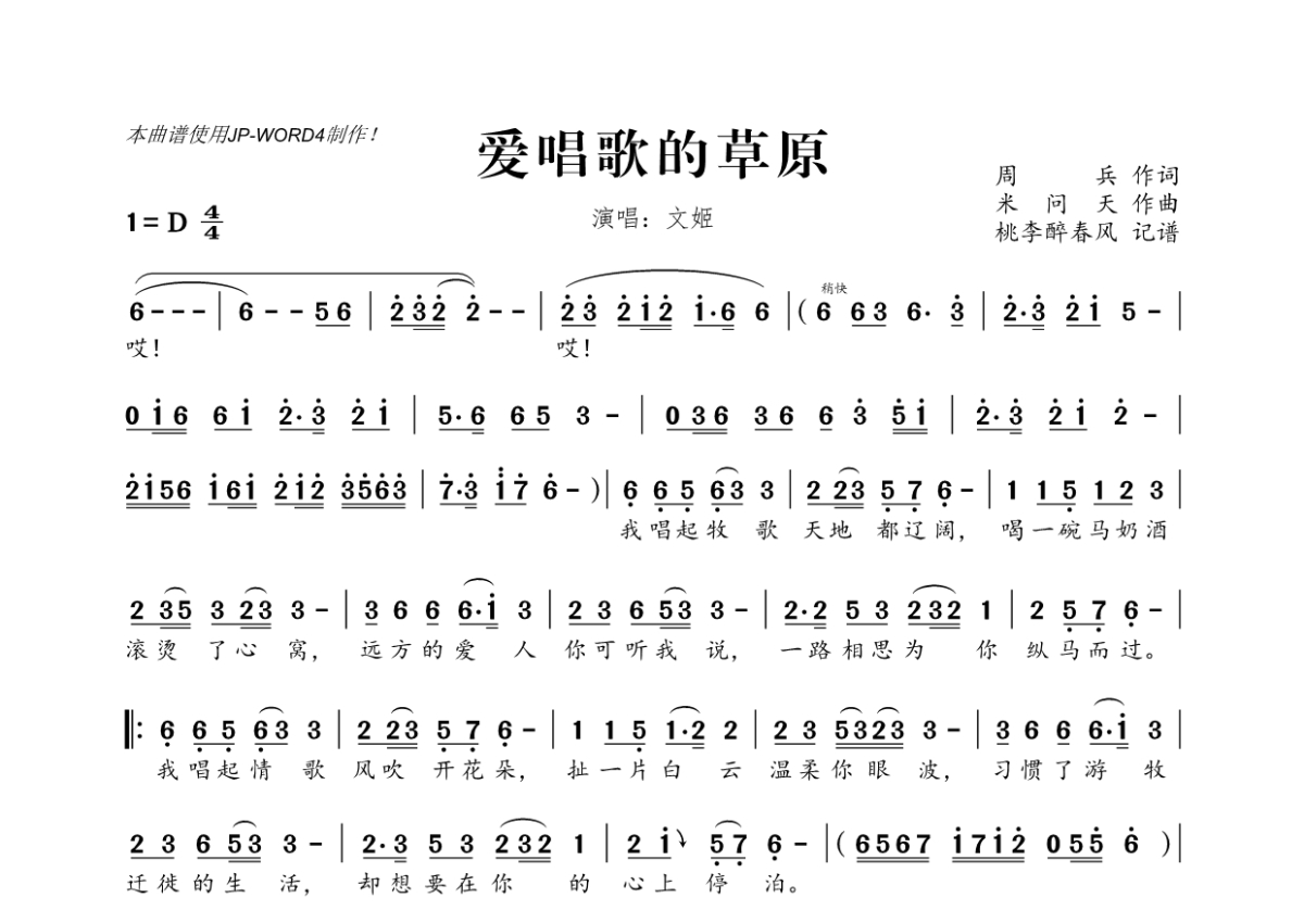 文姬《爱唱歌的草原》简谱